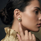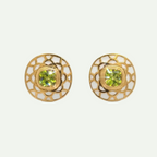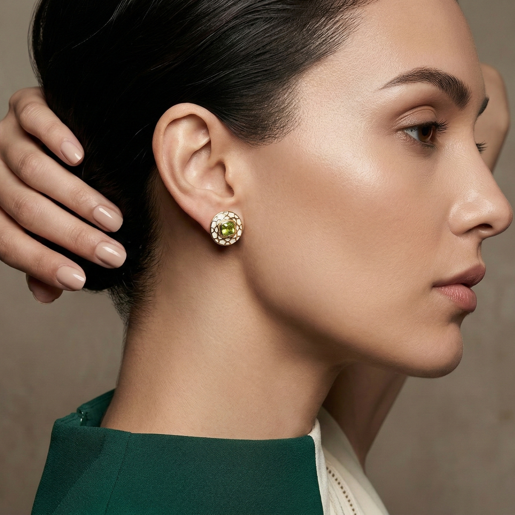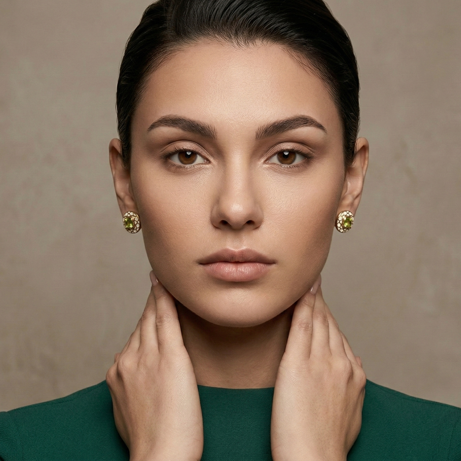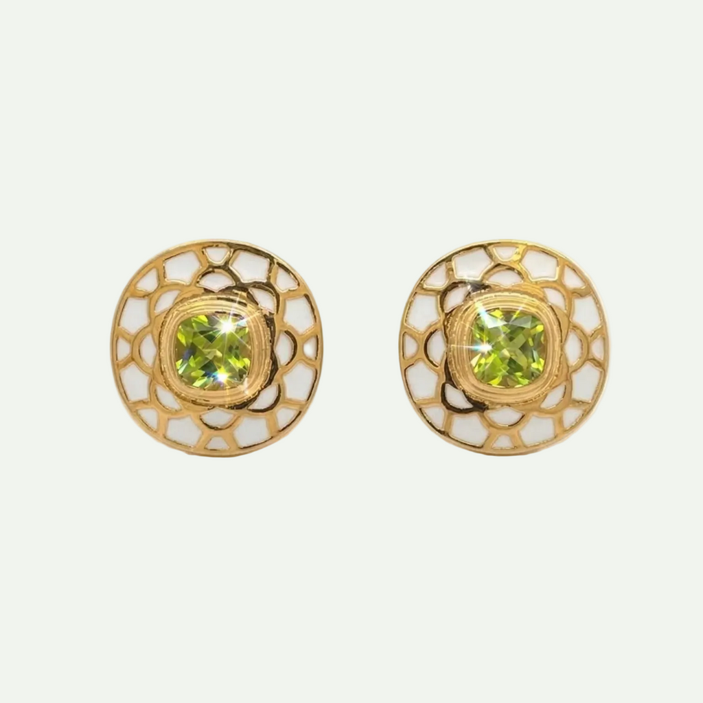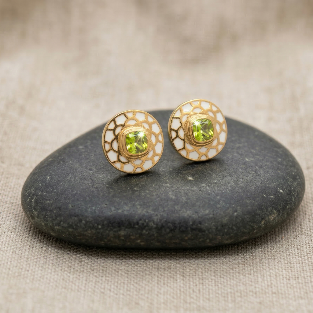 The Peridot Aura Collection is a sanctuary for the soul that breathes life back into the world. You carry a vitality that feels unearthed from a primordial garden—deep, resilient, and impossibly green. Your presence creates a luminous boundary, a gilded perimeter that filters the chaos into clarity. These Fresh Peridot Studs act as the core of that sanctuary. Each cushion-cut gem glows with the trapped light of a forest at noon, held within a delicate, white-latticed armor of gold. They are not merely studs; they are tiny, vibrant shields for the spirit that refuses to dim.